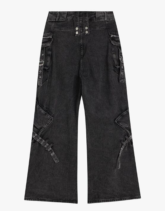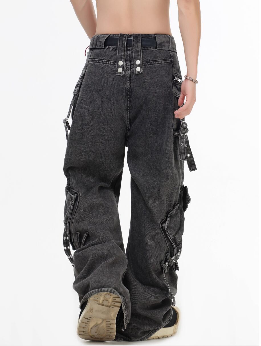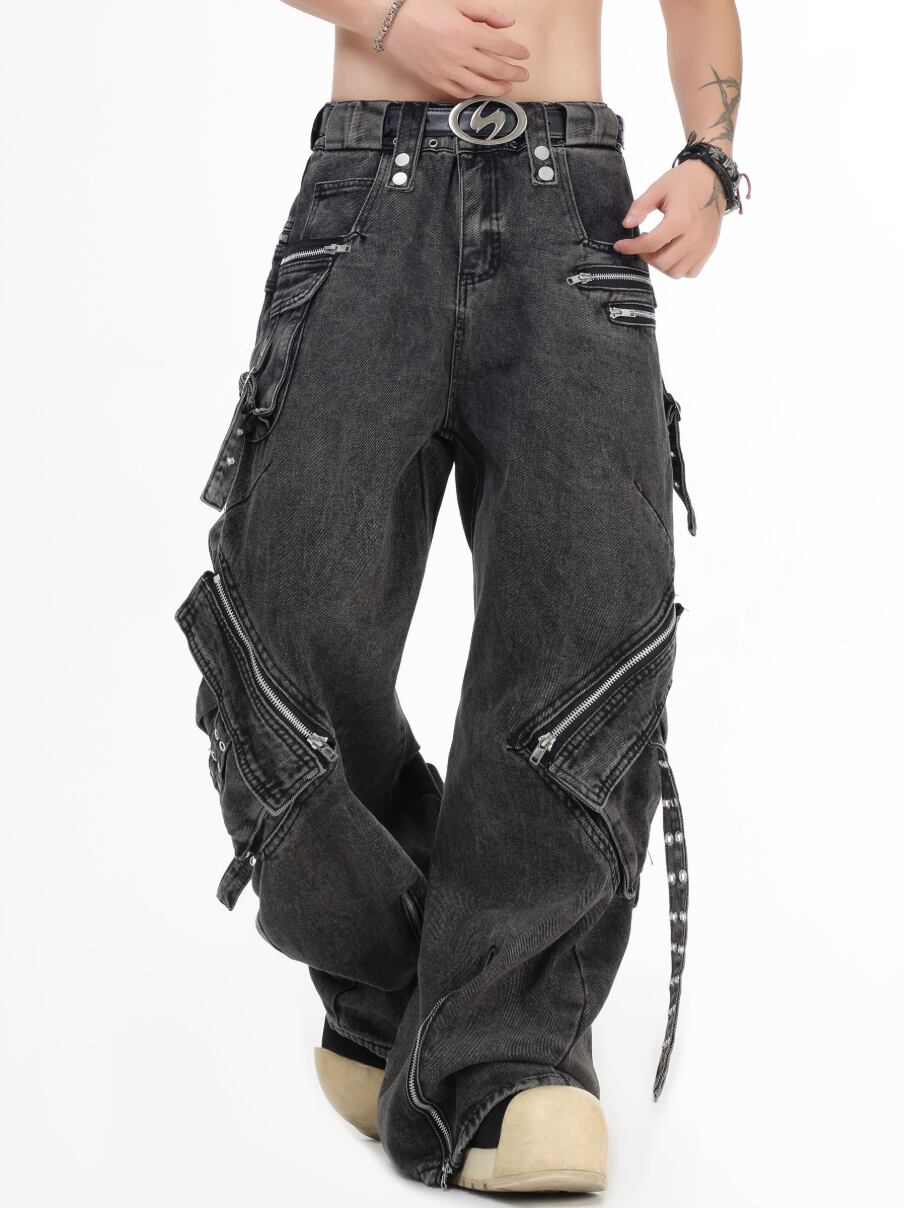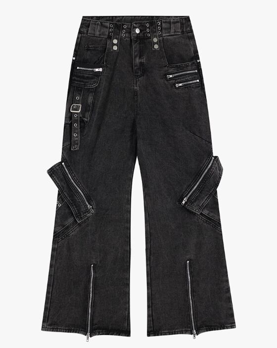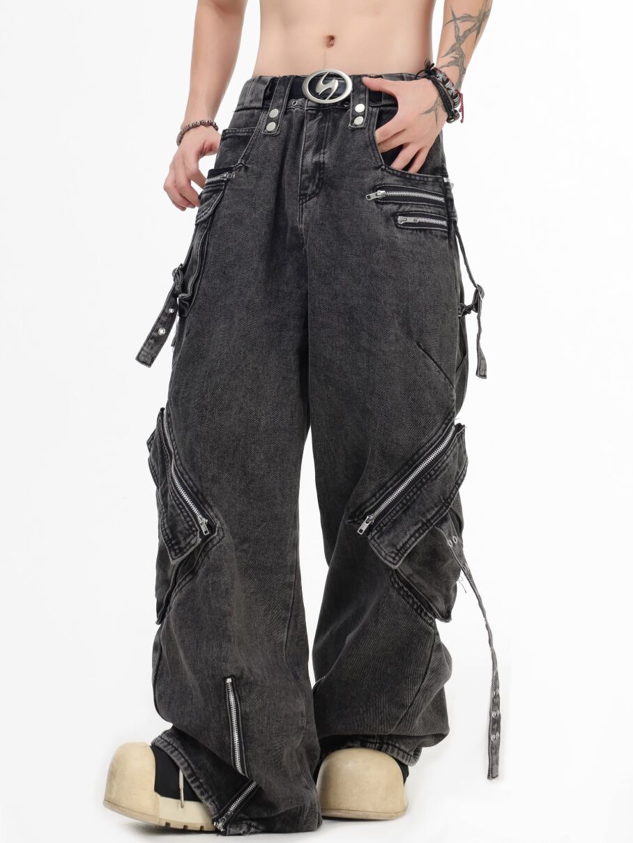 Multi zip drawstring denim pants 0001